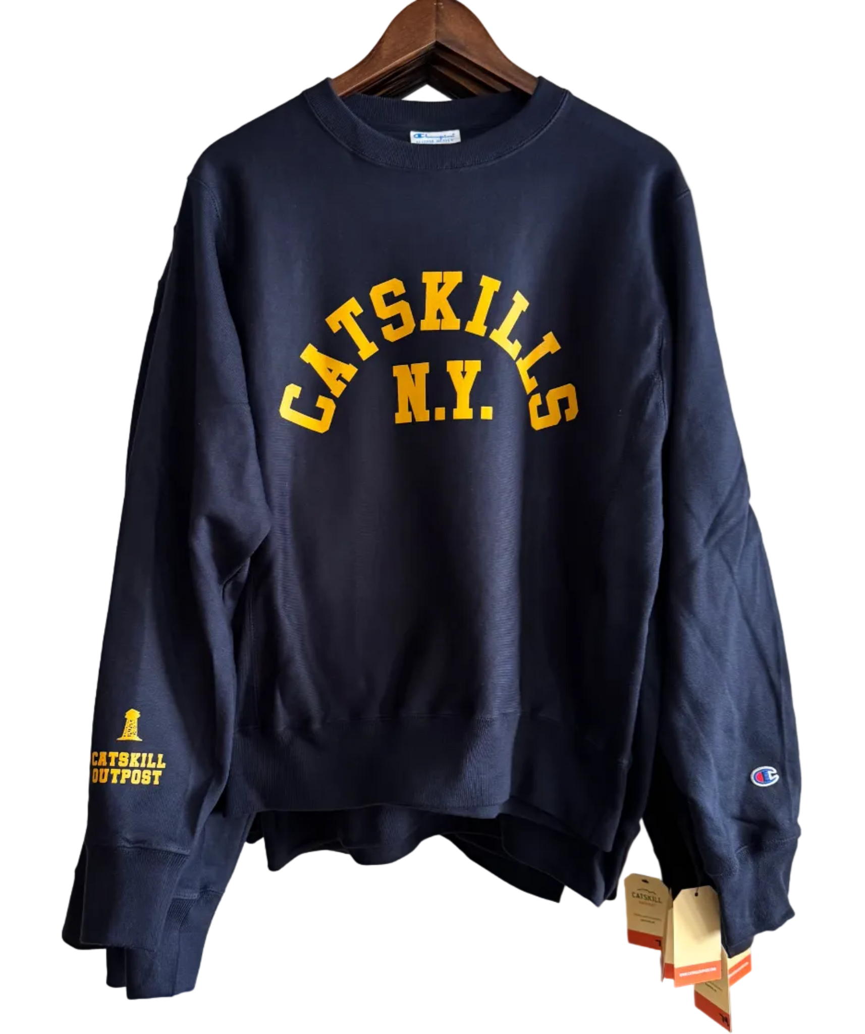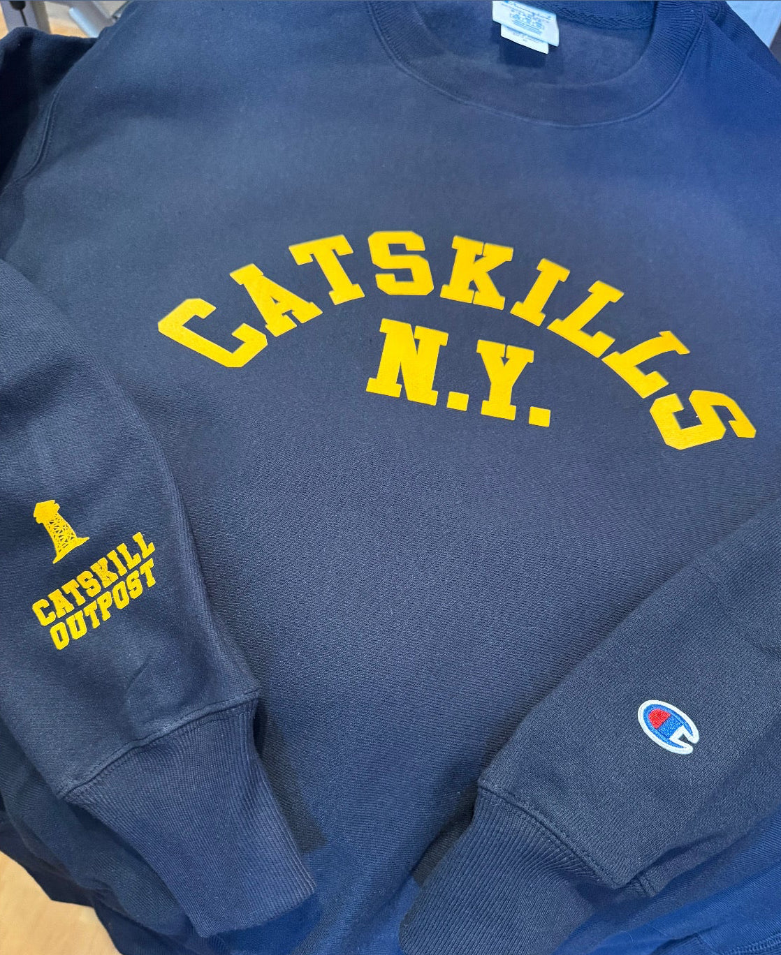 Navy heavy reverse weave Champion sweatshirts with a timeless Catskills arched across the chest and a small sleeve hot design by Catskill Outpost.